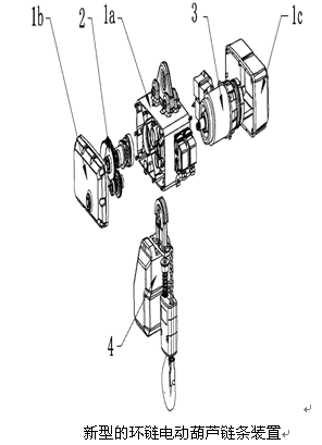 環(huán)鏈電動葫蘆主要由減速器,電機以及鏈條組成,但是由于對減速器,電機以及鏈條的布局不合理,導(dǎo)致環(huán)鏈電動葫蘆的體積較大,同時環(huán)鏈電動葫蘆的零部件數(shù)量很多,由于其零部件多為非標零件,生產(chǎn)這些零件還需要定制很多的模具,這就不利于零部件的生產(chǎn)管理,也不利于環(huán)鏈電動葫蘆生產(chǎn)過程中風險的控制,而且現(xiàn)有技術(shù)中沒有針對繞于鏈輪上的鏈條進行很好的保護,往往在上升過程中容易脫鏈,導(dǎo)致環(huán)鏈電動葫蘆的安全性低。
