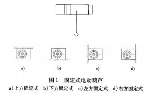 (1)固定式無(wú)運(yùn)行機(jī)構(gòu)、固定使用的電動(dòng)葫蘆,按其安裝方式不同(即座腳在上、下、左、右位置的不同)可分圖1所示四種類型。