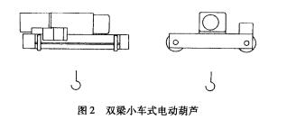 ③雙梁小車式由一臺(tái)固定式電動(dòng)葫蘆和一雙軌型小車組成,該葫蘆小車沿雙梁上的兩條軌道運(yùn)行(見圖2)。