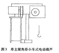 ④單主梁角形小車式由一臺(tái)固定式電動(dòng)葫蘆和一角形電動(dòng)小車組成。該小車沿安裝在單主梁橋架上的軌道運(yùn)行(見圖3)。