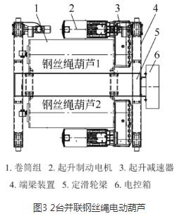 為滿足岸橋上檢修橋機(jī)大起升高度的需要,起升高度達(dá)到63m,以往的設(shè)計(jì)大多采用2臺(tái)10t鋼絲繩電動(dòng)葫蘆并聯(lián)抬吊的形式,其布置方式如圖3所示,鋼絲繩纏繞形式如圖4所示。由于2臺(tái)電動(dòng)葫蘆并聯(lián)抬吊,造成電動(dòng)葫蘆小車(chē)的基距增大,從而造成維修起重機(jī)的小車(chē)工作盲區(qū)加大,這就意味著岸橋的整個(gè)機(jī)房必須加大,進(jìn)一步造成岸橋的成本增加,而且無(wú)法很好地滿足檢修、維修工作。