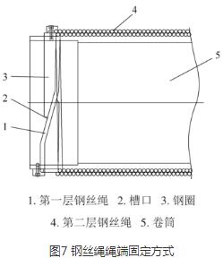 由于第一層鋼絲繩和第二層鋼絲繩在卷筒上有高度差(即鋼絲繩直徑差),使得在卷筒上固定時(shí)不能很好的固定,故需在卷筒上鋼絲繩固定端焊接一鋼圈,鋼圈上開(kāi)一槽口,將第一層鋼絲繩穿過(guò)槽口用壓繩器固定在卷筒上,第二層鋼絲繩用壓繩器固定在鋼圈外表面上完成整個(gè)電動(dòng)葫蘆的繞繩。如圖7所示。