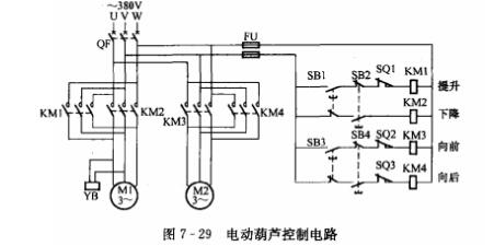 電動(dòng)葫蘆是一種小型起重機(jī)械,多用于設(shè)備的吊裝工作是工廠常用的移動(dòng)工具之一,起重葫蘆葫蘆由吊鉤和移動(dòng)行車(chē)兩部分組成,吊鉤的提升和行車(chē)行進(jìn)各有一臺(tái)電動(dòng)機(jī)推動(dòng)。提升電動(dòng)機(jī)帶動(dòng)滾筒轉(zhuǎn)動(dòng),從而帶動(dòng)吊鉤的提升或下降;行進(jìn)電動(dòng)機(jī)拖動(dòng)提升機(jī)構(gòu)在工字梁上水平移動(dòng),從而帶動(dòng)行車(chē)前進(jìn)或后退。其控制電路如圖7-29所示。