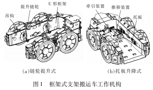 框架式支架搬運(yùn)車(chē)主要用來(lái)拖運(yùn)支架,如圖1所示,其工作機(jī)構(gòu)是基于U形框架的鏈輪提升式(或托板升降式)支架裝載機(jī)構(gòu)。鏈輪提升式機(jī)構(gòu)是利用4 個(gè)吊鉤鉤住支架起吊環(huán),通過(guò)操作提升鏈輪動(dòng)作實(shí)現(xiàn)支架的提升裝載。倘若U形框架內(nèi)寬設(shè)計(jì)較窄,待支架進(jìn)入框架時(shí),支架兩側(cè)剩余空間較小,增加了工人的掛鉤難度,影響了支架的裝卸速度;另外,倘若提升鏈輪的離地高度設(shè)計(jì)較高,待支架進(jìn)入框架時(shí),壞損支架的側(cè)護(hù)板處于張開(kāi)狀態(tài),張開(kāi)的側(cè)護(hù)板極易與提升鏈輪發(fā)生碰撞,阻礙支架進(jìn)入框架,同樣影響了支架的裝載速度。托板升降式機(jī)構(gòu)的裝卸架原理是在裝架時(shí)落下托板,利用牽引裝置將支架牽引至框架內(nèi),卸架時(shí)利用推移裝置將支架推出框架,以此實(shí)現(xiàn)支架的裝卸。倘若在使用過(guò)程中,托板滾輪卡滯,加之牽引裝置繩力設(shè)計(jì)有限,則會(huì)導(dǎo)致裝架困難;倘若推移裝置推出時(shí),其導(dǎo)向套筒發(fā)生變形別卡,則會(huì)導(dǎo)致卸架困難,進(jìn)而影響了支架搬運(yùn)車(chē)的作業(yè)效率。