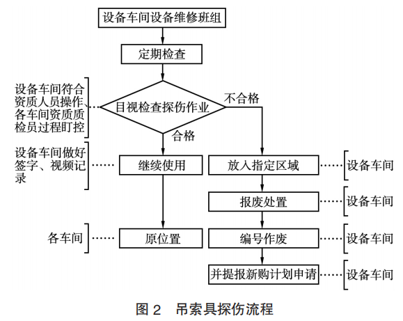 由設備車間定期進行檢查檢測,經(jīng)過探傷后合格的吊索具交由原車間繼續(xù)使用,并做好相關視頻和紙質(zhì)記錄;對檢測不合格的,要放入指定區(qū)域,集中報廢處置并做好記錄,同時啟動新購流程。