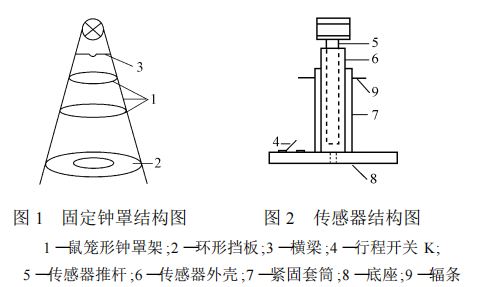 傳感器外殼固定在套筒上,底座則與套筒固定在一起、三者連為一體。設(shè)置環(huán)形擋板和輻條是因為在電動葫蘆制動后,底座和重物砣由于受到自身重力的作用,必然要下滑一段距離,當(dāng)?shù)鬃禄絺鞲衅魍茥U端部時,輻條碰住環(huán)形擋板上表面,底座停止下滑,這樣可避免將推桿從傳感器外殼中拉出。同時,環(huán)形擋板還起著在底座上升時閉合行程開關(guān)的作用。因此,環(huán)形擋板和輻條的安放位置十分關(guān)鍵。環(huán)形擋板的位置應(yīng)保證在測試過程中重物饦推動底座上升到行程開關(guān)碰住環(huán)形擋板底部時,傳感器端部與底座之間仍有一微小距離,這樣就防止了底座撞擊傳感器端部而損壞傳感器。輻條的位置應(yīng)保證底座下滑到碰到環(huán)形擋板時,推桿剛好到達傳感器大位置且未從外殼中拉出。
