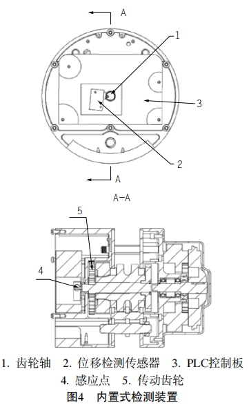 內(nèi)置式高度檢測(cè)裝置如圖4所示,它主要由齒輪軸、位移檢測(cè)傳感器和PLC控制板組成。齒輪軸位于電動(dòng)葫蘆內(nèi),齒輪軸貫穿PLC控制板,PLC控制板上設(shè)有位移檢測(cè)傳感器,位移檢測(cè)傳感器位于齒輪軸旁,PLC控制板與位移檢測(cè)傳感器電連接,齒輪軸上設(shè)有感應(yīng)點(diǎn),感應(yīng)點(diǎn)與位移檢測(cè)傳感器配合。