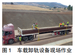 從設(shè)備的耐用性出發(fā),設(shè)備需要結(jié)構(gòu)簡(jiǎn)單,操作簡(jiǎn)單,維修方便,制作維護(hù)成本低,從設(shè)備的安全性出發(fā),設(shè)備需要滿足長(zhǎng)途運(yùn)輸過(guò)程中自身不脫落車(chē)體,并且滿足在裝卸鋼軌過(guò)程中的承重能力達(dá)到要求,從設(shè)備的快速機(jī)動(dòng)性出發(fā),起重裝置需采用電力驅(qū)動(dòng),以提升起重升降的效率。另外設(shè)備的運(yùn)行狀態(tài)需 要針對(duì)鋼軌運(yùn)輸過(guò)程中的各種狀態(tài)快速切換,如在基 地裝車(chē)鋼軌時(shí)不能影響大型龍門(mén)吊作業(yè),運(yùn)至現(xiàn)場(chǎng)后 快速切換至卸軌作業(yè)狀態(tài),作業(yè)狀態(tài)中卸軌后行進(jìn)至下一卸軌里程點(diǎn)的短程行進(jìn)狀態(tài)與裝卸狀態(tài)能夠快速切換,根據(jù)上述需求,從實(shí)際情況出發(fā),項(xiàng)目所使用的運(yùn)軌設(shè)備是兩臺(tái)國(guó)內(nèi)采購(gòu)的可伸縮平板車(chē),縮合狀態(tài)時(shí)長(zhǎng)度為12m可用于運(yùn)送軌枕,最大伸長(zhǎng)狀態(tài)時(shí)長(zhǎng)度為18m 用于運(yùn)送鋼軌,則需要將卸軌設(shè)備與平板車(chē)結(jié)合起來(lái)。參照已有的大型龍門(mén)架,可以在平板車(chē)上設(shè)計(jì)一 個(gè)縮小版的門(mén)架式體系,平板車(chē)頂面兩側(cè)設(shè)有數(shù)個(gè)插槽,原本是為防止運(yùn)輸中鋼軌脫落放置立柱使用,現(xiàn)可借助該立柱,輔以一根橫梁以及一根立于地面的支柱,形成一個(gè)門(mén)架式體系,門(mén)架式體系形成后,模仿基地裝卸鋼軌的大型龍門(mén)吊,在橫梁上安裝一個(gè)可以滑動(dòng)的電動(dòng)葫蘆,在車(chē)尾處安裝一臺(tái)發(fā)電機(jī)以提供動(dòng)力。在鋼軌上選取兩個(gè)吊點(diǎn)設(shè)置兩組門(mén)架體系,使用裝在橫梁上電動(dòng)葫蘆的夾具,即可成功達(dá)到裝卸鋼軌的目的,如圖1所示。