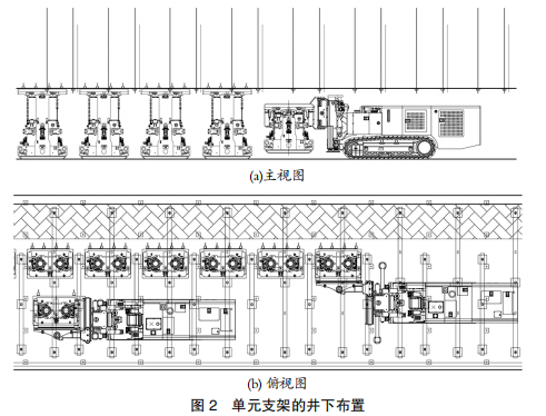在沿空留巷工作面,單元支架通常布置在工作面后部,可以給脫模后墻體提供臨時(shí)保護(hù),能夠保證在墻體凝固到一定強(qiáng)度前不承接頂板壓力。為防止反復(fù)撐頂破壞頂板,單元支架的移動(dòng)采用無反復(fù)支撐的方式。撤除時(shí),采用專用搬運(yùn)車將最后面的支架移至最前面,保證留巷頂板完好。單元支架在井下工作面的布置如圖 2 所示。