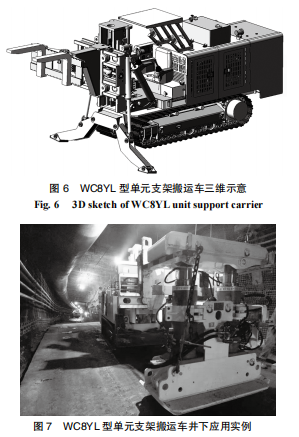 為提高單元支架的搬運(yùn)效率,聯(lián)合專業(yè)廠家研發(fā)了 WC8YL 型單元支架專用搬運(yùn)車,并已在神東集團(tuán)錦界煤礦、新汶集團(tuán)內(nèi)蒙能源長城三礦、陜西麟北煤業(yè)園子溝煤礦等多家煤業(yè)公司成功應(yīng)用。WC8YL 型單元支架搬運(yùn)車三維示意及井下應(yīng)用實(shí)例如圖 6、7 所示。